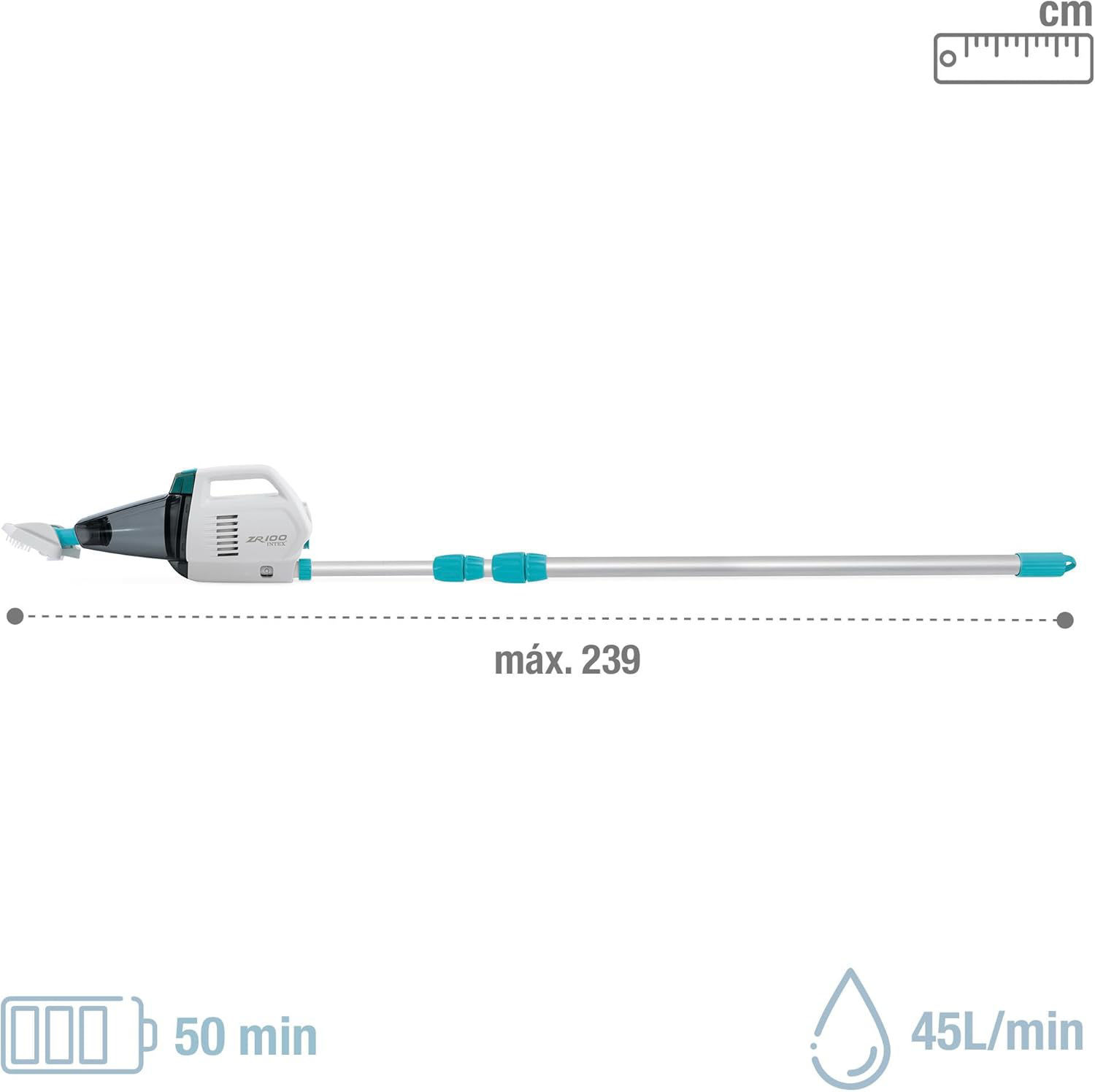 Un aspirateur de piscine à batterie rechargeable conçu pour le nettoyage manuel des spas et des piscines hors-sol jusqu'à 5,49 mètres de diamètre. Caractéristiques Principales *Performance d'aspiration : Il possède une capacité d'aspiration de 45 litres par minute. *Autonomie & Batterie : Équipé d'une batterie Ni-MH de 4V 2Ah, il offre jusqu'à 50 minutes d'utilisation continue après une charge complète de 5 à 6 heures via USB. Sécurité & Protection : *Arrêt automatique : L'appareil s'arrête dès qu'il n'est plus immergé pour protéger le moteur. *Étanchéité : Certifié IPX8 avec un interrupteur étanche. Accessoires inclus : *Un manche télescopique en aluminium léger de 2,39 m. *Deux têtes de brosse interchangeables pour les surfaces planes et les recoins. *Un sac collecteur de débris transparent de 0,8 litre.