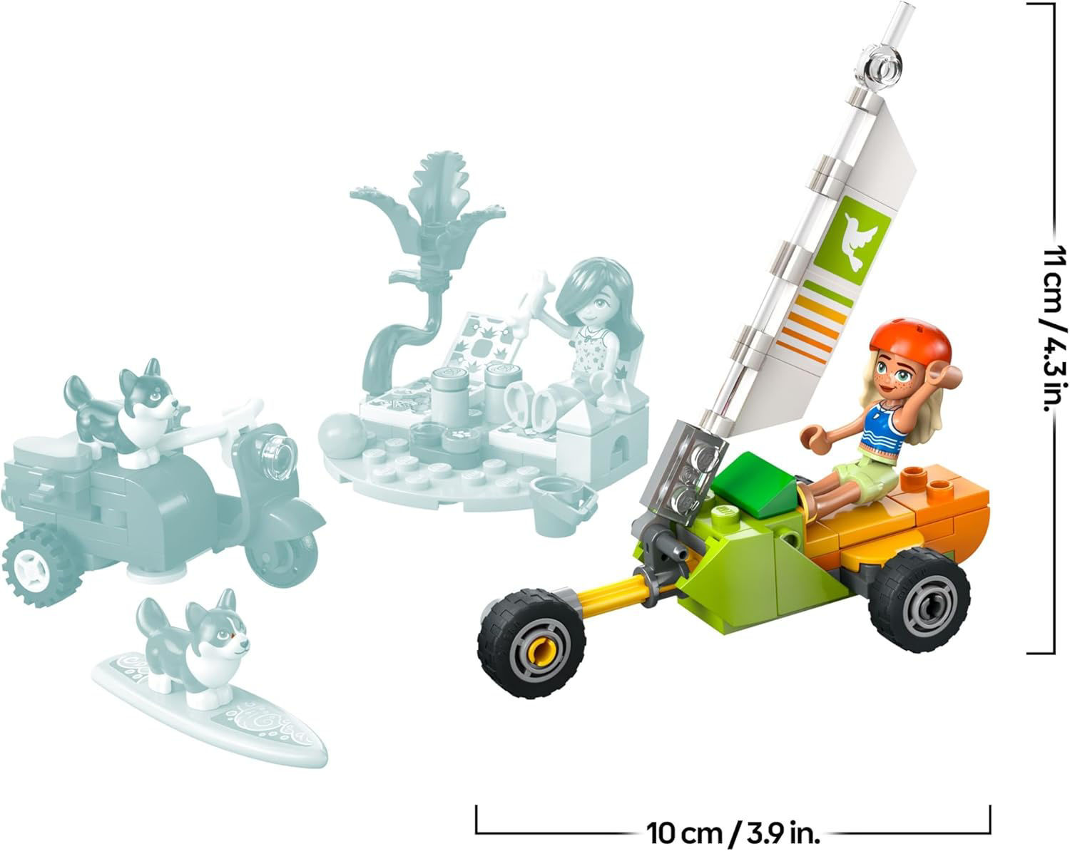 Le surf est roi avec ce jouet de construction LEGO pour les filles, les garçons et les amoureux des animaux dès 6 ans. Invitez les enfants à créer leurs propres aventures à la plage avec Chiens surfeurs et aventures en scooter LEGO Friends (42641). Ce jouet interactif LEGO contient une planche de surf miniature, un scooter, un char à voile et des chaises longues. Il inclut également 2 mini-poupées LEGO Friends et 2 Corgis. C’est une belle idée de cadeau LEGO pour les enfants qui aiment le jeu de rôle. Sage et Paisley adorent emmener leurs Corgis à la plage. Pendant que les amies se détendent sur leurs chaises longues, les chiots surfent à tour de rôle. Ensuite, elles partent en balade en scooter ou en char à voile, où il y a même de la place pour un chiot ! L’univers LEGO Friends regorge d’idées de cadeaux pour enfants (sets vendus séparément). Dimensions – Ce set de 113 pièces inclut un char à voile qui mesure plus de 11 cm de haut, 10 cm de long et 4 cm de large.