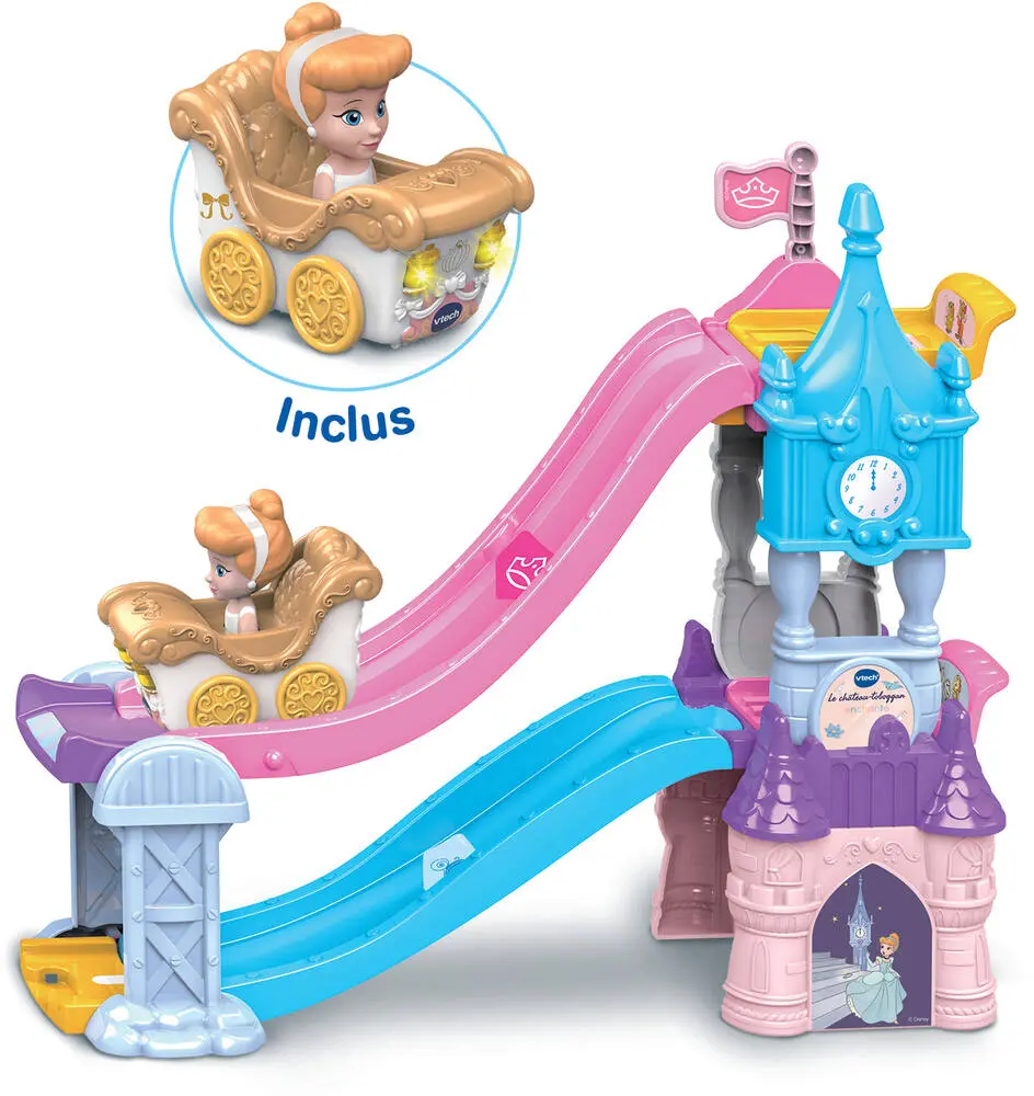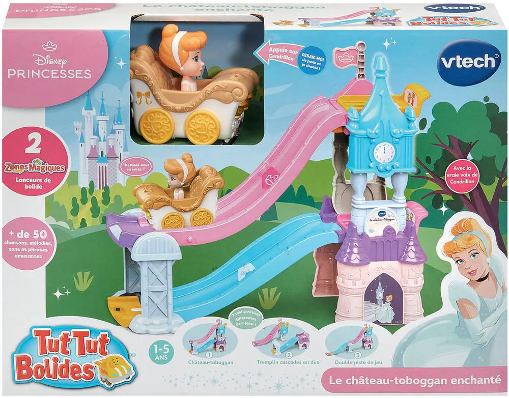 Voyagez dans l'univers féérique des princesses Disney avec Le château-toboggan enchanté des Tut Tut Bolides. Les petites voitures Tut Tut Bolides sont des véhicules parlants et musicaux pour laisser libre cours à l'imagination et la créativité des tout-petits. Les enfants, dès 1 an, découvrent un château magique à transformer pour créer différentes pistes et faire voyager les Tut Tut Disney Princesses dans un univers féérique ! En effet, cet univers de jeu modulable est sur le thème de Cendrillon. Les enfants peuvent créer un château-toboggan, une double piste de jeu et un tremplin cascades en duo. Le château comprend deux zones magiques qui sont compatibles avec l’ensemble des véhicules Tut Tut Bolides. Ces zones permettent de déclencher des phrases comme par magie dès qu’un véhicule roule dessus. Ce circuit Tut Tut Bolides propose 3 chansons et 6 mélodies pour participer à l'éveil musical des enfants. Ce coffret comprend un véhicule Tut Tut Bolide électronique : le carrosse mariage enchanté de Cendrillon, pour jouer et rouler à travers cet univers fantastique. Véhicule avec arrêt automatique.