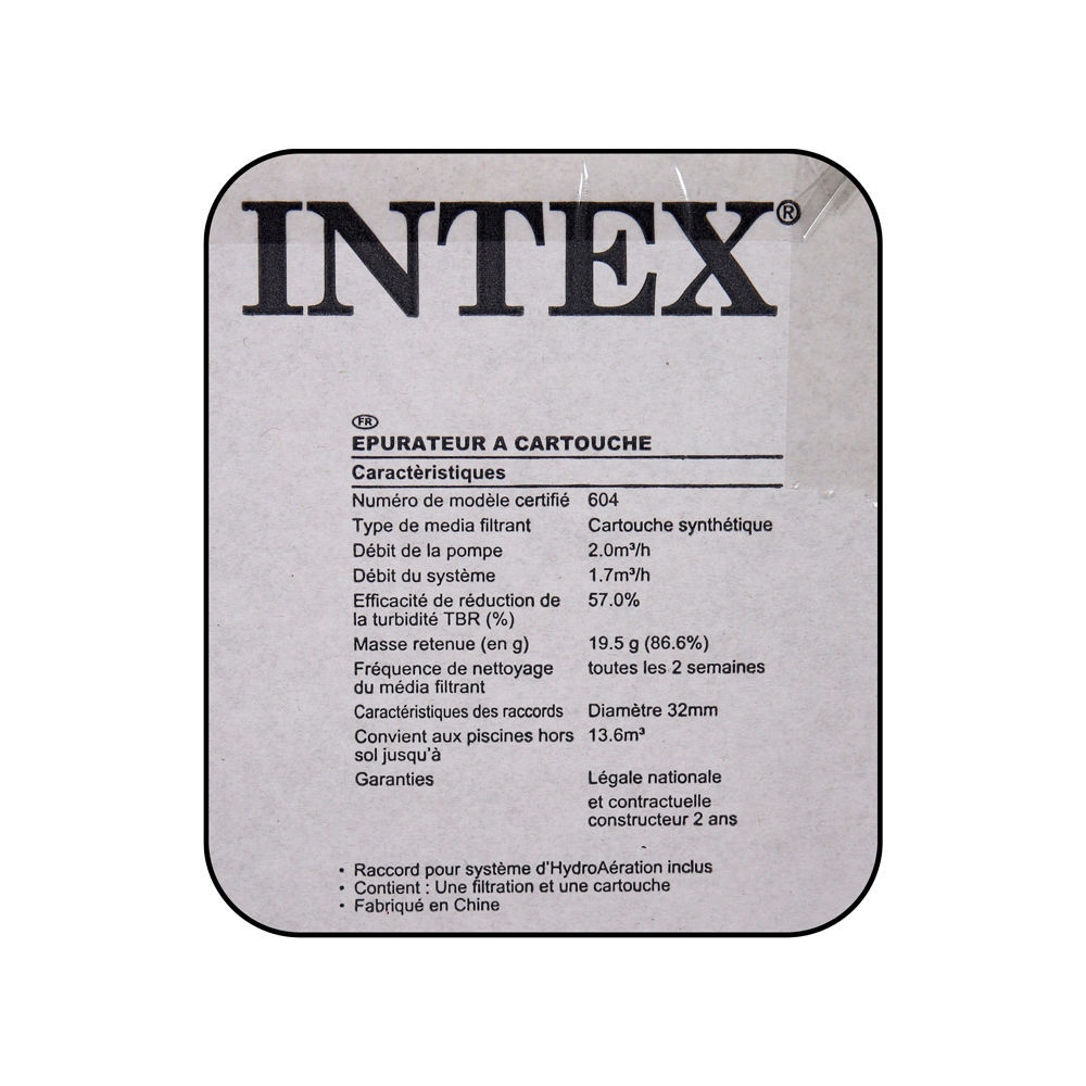 Débit filtration1,7 m³/h, Type cartoucheA, 220-240V, Consommation45W, Diamètre tuyau32 MM, Longueur tuyau3M, Taille carton(p)29,80 x (l)29,80 x (h)38,10 cm, Poids carton3,22 kg, Purge à air, Finesse de filtration15-20 microns, Non inclusAdaptateur 32-38 mm, Type de PiècePompes, Pour piscines jusqu'à10 m³.