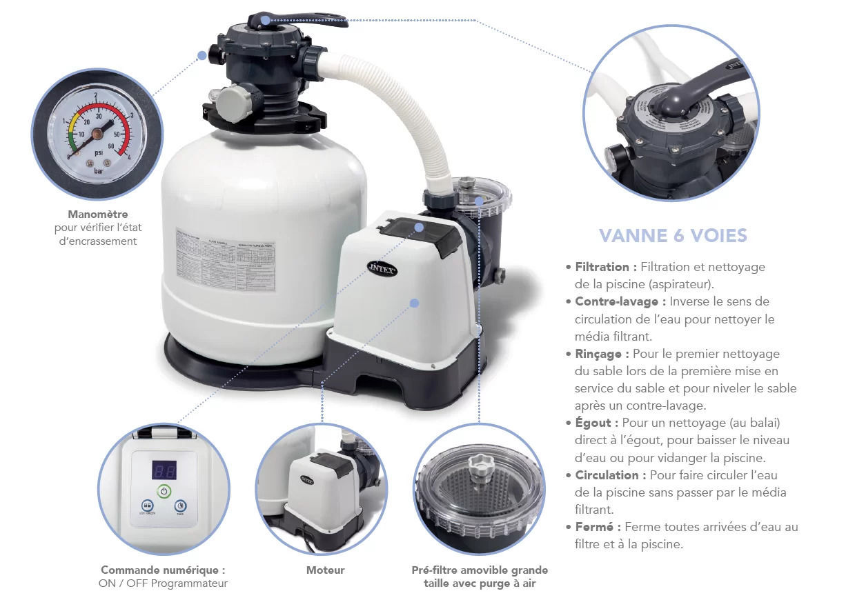 Intex - 26644FR - Filtre à sable SX1500 4m³/h pour piscine jusqu'à 24m³ Le filtre à sable SX1500 d'Intex est un équipement de filtration hautement performant conçu pour maintenir l'eau de votre piscine propre et cristalline. Avec une capacité de filtration de 4 m³/h, ce système de filtration est idéal pour les piscines jusqu'à 24m³, assurant une qualité d'eau optimale pour des baignades agréables tout au long de l'été. Intex sx1500, l'équipement de filtration pour piscine Profitez d'une eau limpide et d'une piscine toujours prête à vous accueillir grâce au filtre à sable SX1500 d'Intex ! Conçu pour répondre aux besoins des propriétaires de piscines jusqu'à 24m³, ce système de filtration de qualité supérieure vous offre une solution fiable et efficace pour garder votre eau propre et claire, tout en réduisant l'utilisation de produits chimiques. Avec une capacité de filtration de 4 m³/h, le filtre à sable SX1500 vous garantit un nettoyage rapide et performant de votre piscine. Il est équipé d'un réservoir de sable durable qui capture efficacement les impuretés, les particules et les saletés, laissant votre eau propre et saine pour des moments de détente en famille ou entre amis. Ce système de filtration est facile à utiliser et à entretenir. Son programmateur intégré permet de régler les cycles de filtration en fonction de vos préférences, et son écran de contrôle vous permet de surveiller le processus de filtration en temps réel. Le filtre à sable SX1500 d'Intex est également économique et respectueux de l'environnement. En utilisant du sable comme média filtrant, il réduit considérablement les coûts liés à l'entretien de la piscine tout en étant plus respectueux de l'environnement que les systèmes de filtration traditionnels. Ne laissez pas les impuretés gâcher votre plaisir de la baignade ! Optez pour le filtre à sable Intex SX1500 et offrez à votre piscine une filtration de haute qualité qui vous permettra de profiter pleinement de vos moments de détente au bord de l'eau. Caractéristiques techniques du filtre à sable Intex sx1500 - Filtre à sable SX1500 d'Intex, adapté aux piscines jusqu'à 24m³. - Capacité de filtration : 4 m³/h. - Écran de contrôle pour surveiller le processus de filtration en temps réel. - Programmateur intégré pour ajuster les cycles de filtration. - Utilisation de sable comme média filtrant pour une filtration efficace et économique. - Facile à installer, utiliser et entretenir.