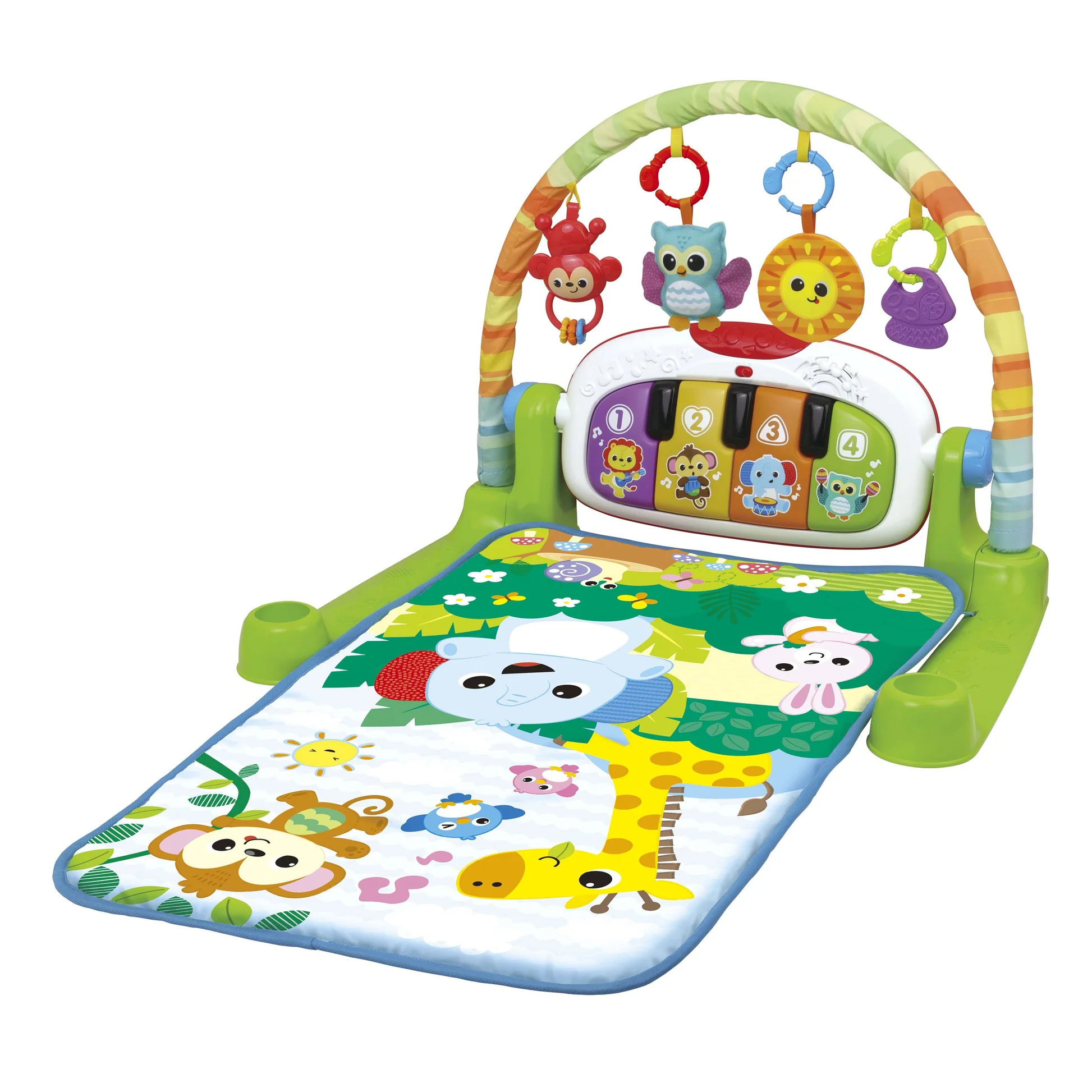 Tapis de jeu musical Jungle Pals Kick 'N Play 5 façons de jouer : allongé, avec les pieds, sur le ventre, assis et à emporter Clavier de piano amovible avec 4 touches lumineuses et 2 modes de jeu Déplacez facilement le clavier : de la position verticale pour jouer avec les pieds à la position inclinée pour jouer assis Tapis de jeu rembourré doux et facile à nettoyer 4 adorables jouets suspendus encouragent l'éveil et la préhension : le hibou couineur, le soleil et l'abeille froissés, l'anneau de dentition texturé et le hochet singe Retirez les jouets suspendus pour les fixer ailleurs ou les emporter.