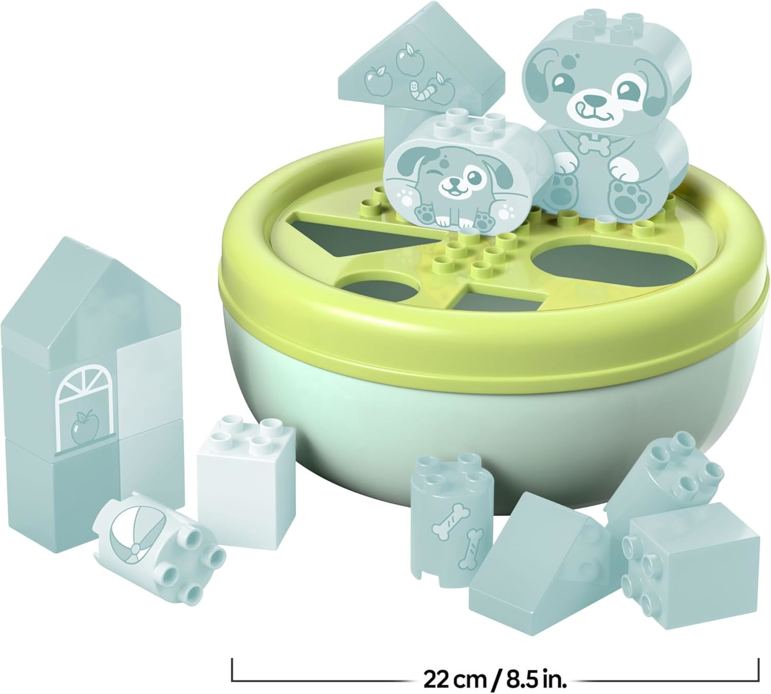 Le Trieur de formes : la niche du chiot (10441) propose 2 modes de jeu. Ce jouet LEGO, stimulant la motricité fine chez les tout-petits à partir de 18 mois, apprend à distinguer les formes et à résoudre les problèmes en s'amusant. Les jeunes enfants peuvent utiliser les briques pour construire un espace de jeu pour les chiens, puis insérer les formes dans les trous du couvercle. Ce jeu de construction favorise le raisonnement spatial et propose de nombreuses activités d’éveil amusantes à partager en famille. Les parents peuvent montrer les différentes formes du set, que les tout-petits utilisent pour construire des arbres, des figurines de chiens et même une niche. Une balle et un os inspirent des jeux créatifs avec les adorables chiens LEGO DUPLO. Après le jeu d’imagination commence le jeu de tri des formes. Les enfants apprennent la patience et la concentration en choisissant la bonne forme pour chaque trou. Et s’ils se trompent, ils développent leur persévérance et leur coordination œil-main en essayant à nouveau. Dimensions – Ce set inclut un bol avec couvercle mesurant plus de 22 cm de diamètre. Le set contient 17 pièces