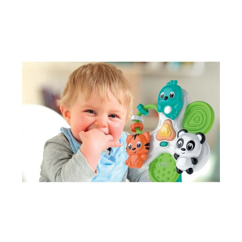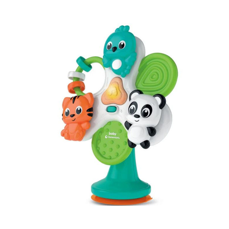 Une amusante roue et ses animaux pour divertir les plus petits avec de jolies mélodies et des effets sonores. Les 3 sympathiques animaux tournent avec la roue et sur eux-mêmes. Avec 3 anneaux à manipuler et des textures à explorer. La ventouse située sous la base permet de fixer le jeu sur la chaise haute de manière pratique et simple. Avec plein de mélodies et de sons qui amuseront l’enfant tout en en stimulant ses sens et sa coordination œil-main. Dimensions : 20 x 25 x 12 cm