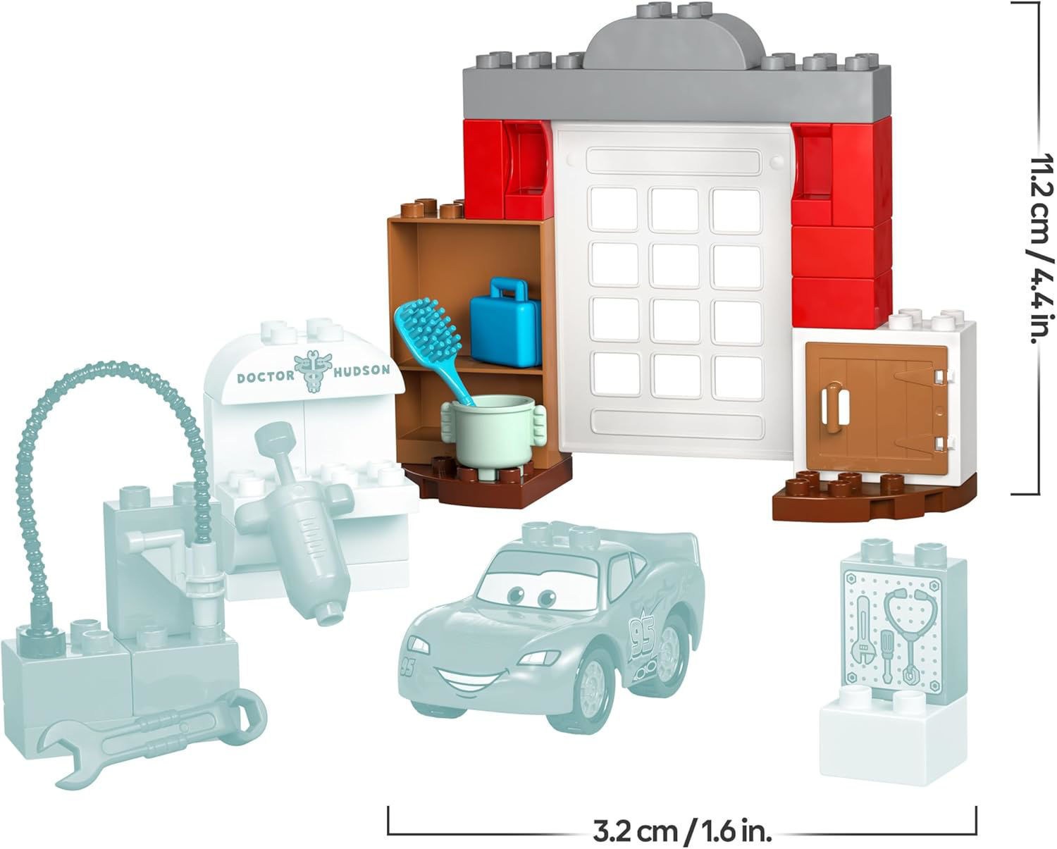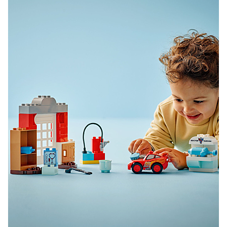 Invitez les enfants dès 2 ans à prendre soin de leur bolide préféré avec le jeu de construction La visite de McQueen au garage de Doc LEGO DUPLO │ Disney et Pixar Cars (10456). Ce set LEGO les transporte dans l’univers des films Cars, de Disney et Pixar, tout en éveillant leur bienveillance par le biais du jeu créatif. Le jeu d’imagination commence lorsque Flash McQueen déboule en faisant crisser ses pneus dans le garage de ce jouet de construction. Les tout-petits vont adorer faire entrer et sortir la voiture en poussant la porte battante. Ils peuvent développer leur motricité fine en utilisant la clé, ouvrir et fermer la porte du placard et décrocher le tuyau de la station de lavage pour débarrasser Flash de la poussière de la course. Les jeux de construction LEGO DUPLO contribuent au développement des compétences préscolaires. Ce set affine les aptitudes émotionnelles des tout-petits qui prennent soin de la voiture. Dimensions – Ce set de construction mesure plus de 19 cm de haut, 48 cm de large et 12 cm de profondeur. Le set contient 35 pièces
