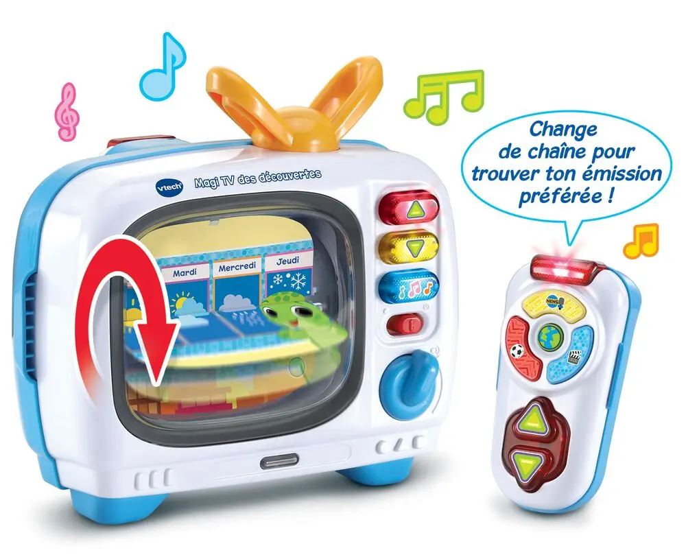La Magi’TV des découvertes est une télévision interactive conçue pour les enfants dès 12 mois. Elle invite bébé à imiter les grands en zappant entre 10 chaînes, dont 5 bilingues, réparties en 3 catégories : Informations, Divertissements et Sports. L’enfant découvre les animaux, la météo, les aliments, les formes, les chiffres, le sport et écoute des chansons et mélodies entraînantes. La télévision dispose d’un écran animé avec boutons pour régler le volume et changer les chaînes. La télécommande interactive et lumineuse permet de sélectionner les thématiques, de changer de chaîne et de basculer du français à l’anglais sur les chaînes bilingues. Avec 12 chansons et 9 mélodies, cet appareil offre un arrêt automatique et un réglage du volume sonore.