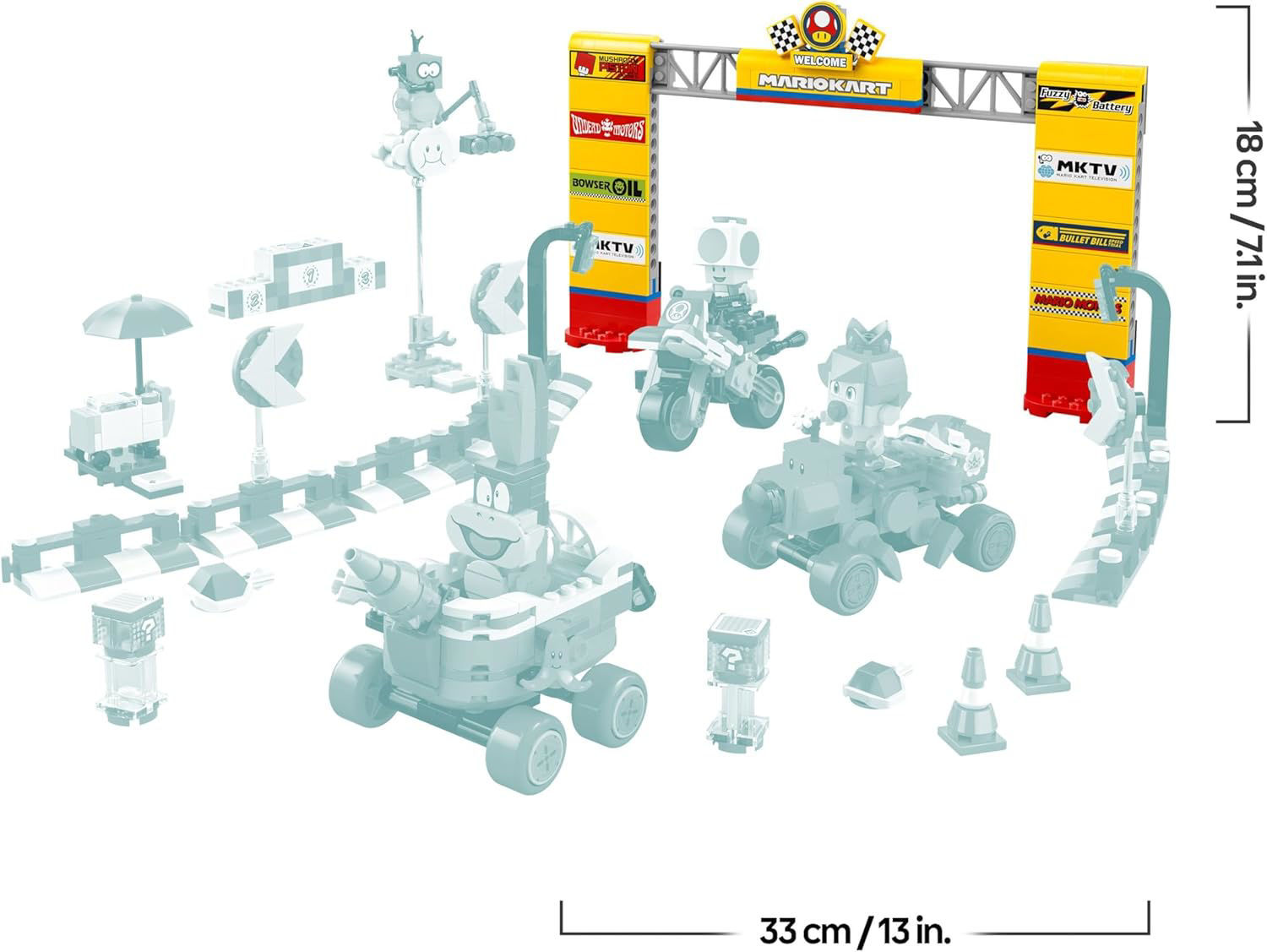 À vos marques, prêts, construisez ! Invitez les enfants de 8 ans et plus à créer leur circuit et leurs véhicules Mario Kart, à foncer vers la victoire et à incarner des personnages Nintendo culte avec le set LEGO Super Mario : Mario Kart – Bébé Peach et ensemble de grand prix (72036). Voilà un beau cadeau LEGO Super Mario pour les enfants dès 8 ans. Ce jouet de construction LEGO Nintendo inclut un quad Wiggler, une Caravéloce et une moto standard lançant des carapaces, une porte de départ, des barrières, des cônes, un podium, le chariot de sucreries de Toad et le nuage de Lakitu. La porte de départ de ce set de 823 pièces mesure plus de 18 cm de haut, 33 cm de large et 4 cm de profondeur.
