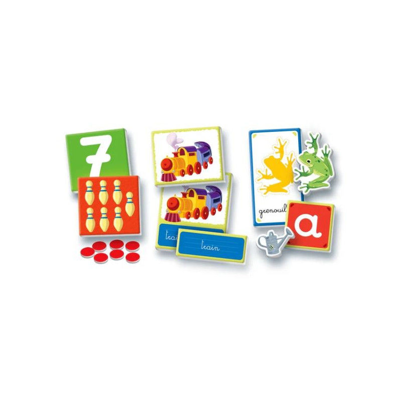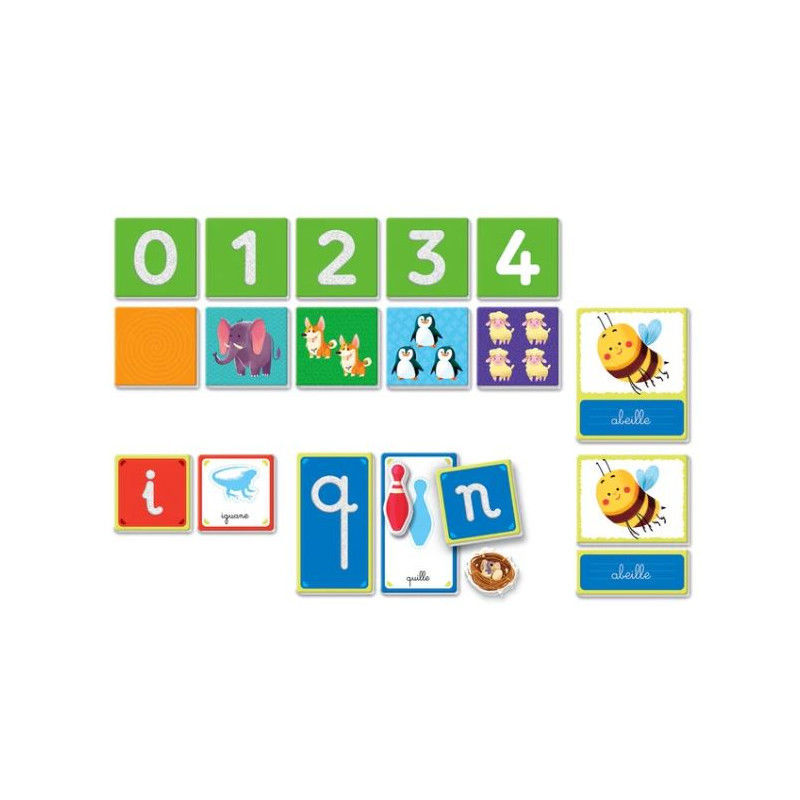 Ce coffret destiné aux enfants d'âge préscolaire fournit tout ce dont ils ont besoin pour apprendre l'alphabet, les chiffres, les formes et les couleurs par le toucher, le mouvement et la créativité. Le coffret contient des lettres et des chiffres en plastique coloré, de la pâte à modeler pour réaliser des formes, un abécédaire et un puzzle avec les chiffres et les quantités. Le coffret comprend également des planches illustrées à compléter avec des formes en carton et des cartes avec des mots à écrire à l'aide des lettres en plastique. Des cartes permettent aussi de réaliser des activités supplémentaires : jouer avec les chiffres en plastique, créer des objets et des animaux en pâte à modeler… Et pour jouer en mouvement, certaines cartes invitent les enfants à mimer des lettres avec le corps ou à faire des petits exercices en comptant. Un coffret complet pour aider les plus jeunes à apprendre les concepts de base abordés à l'école maternelle. Dimensions : 37 x 28.1 x 5.5 cm
