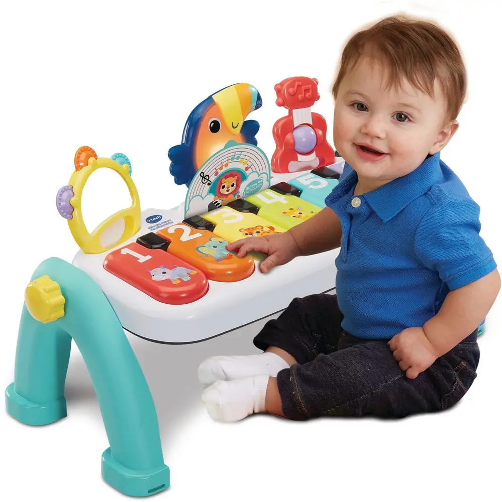 Mon super piano des découvertes - 9 - 36 mois Un grand piano interactif avec une base stable pour que Bébé devienne un vrai petit maestro ! • Un piano interactif avec 6 touches de piano colorées pour découvrir les notes de musique, les animaux, les couleurs, les chiffres et déclencher des mélodies. Le ventre du toucan s’illumine au rythme des mélodies et attire le regard de Bébé. • 2 manières de jouer : les pieds du piano se détachent facilement pour que Bébé puisse jouer sur le ventre ou en étant assis avec 2 positions règlables : horizontale ou inclinée. • 3 accessoires musicaux pour stimuler la vue et la motricité fine de Bébé : une guitare avec un rouleau à faire tourner, un hochet tambourin avec miroir pour que Bébé puisse appréhender son reflet et jouer de la musique et 3 partitions recto verso. • 7 chansons et 14 mélodies. Arrêt automatique. Boîte Try-me.