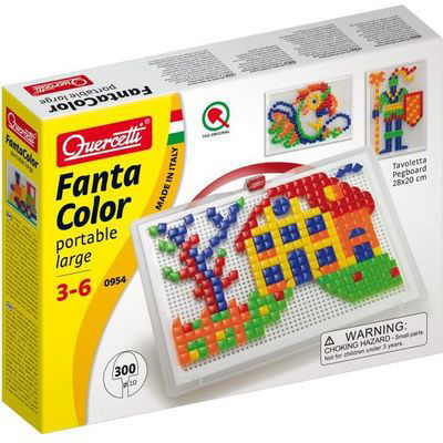 Fantacolor portable est un jeu d'agencement intemporel qui a amusé des générations d'enfants: en insérant les chevilles dans la tablette, les enfants expriment librement leur créativité et entraînent la coordination œil-main. Vous pouvez inventer différentes mosaïques ou vous pouvez même copier les exemples dans l'album. Toutes les pièces sont stockées dans un étui facile à transporter et adapté au voyage. Afin de garder les chevilles bien rangées, la tablette a également une fonction de couvercle. La poignée n’aide pas seulement au transport mais elle permet également de suspendre la mosaïque au mur afin de décorer la pièce de manière originale. Pour défaire facilement une composition, retourne la tablette sur le sac à main et poussez les chevilles.