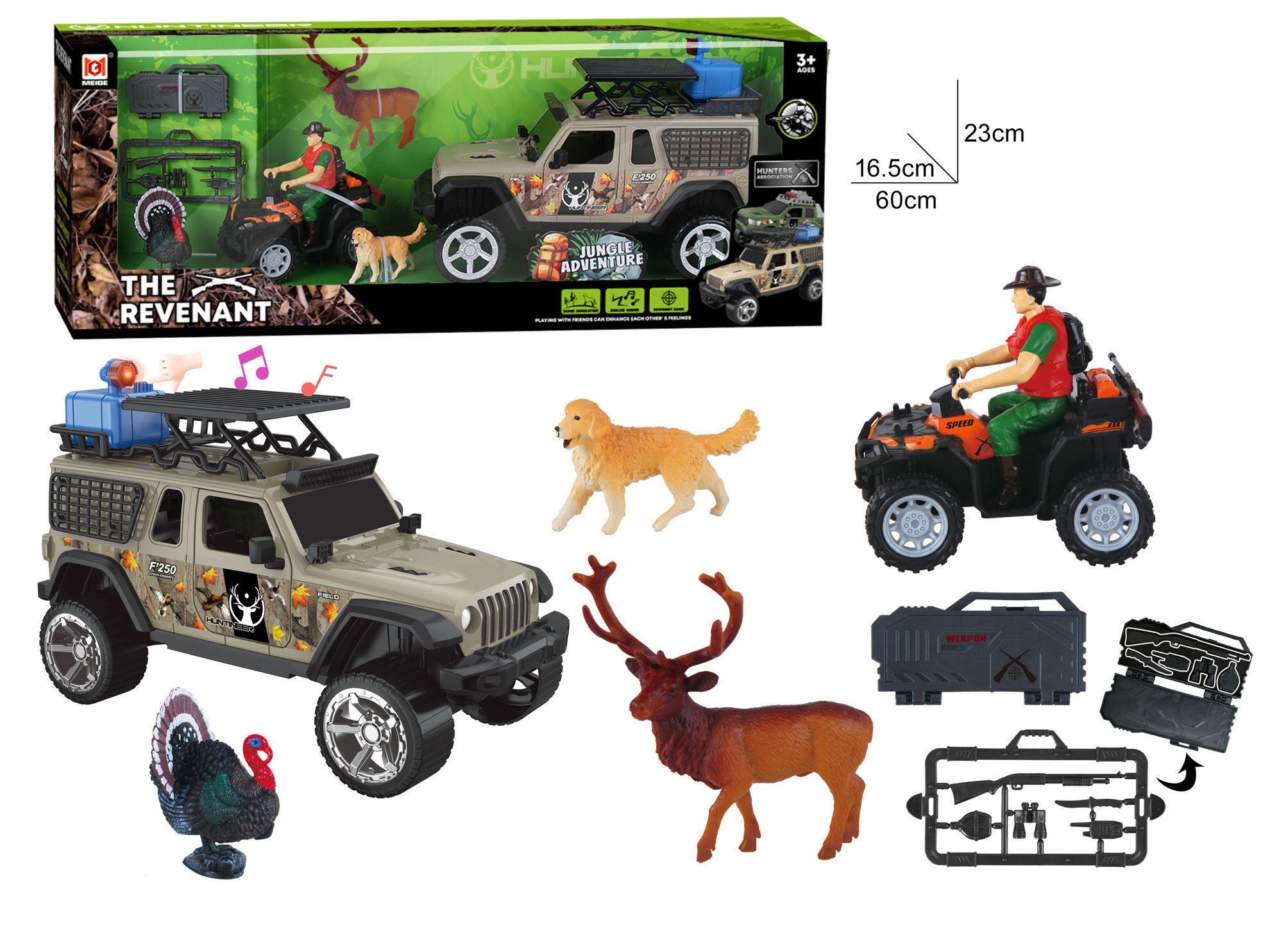 Ce coffret de jeu "The Revenant – Jungle Adventure" est un ensemble de jouets sur le thème de l'exploration et de la chasse. Il comprend : *Un véhicule tout-terrain type Jeep avec décoration camouflage, galerie de toit et effets sonores/musique. *Un quad avec figurine de conducteur habillé pour l’aventure. *Trois figurines d’animaux : un chien, un cerf et une dinde. *Des accessoires de chasse : mallettes, caisse de transport et un support avec armes miniatures. Dimensions de la boîte : environ 60 cm de long, 23 cm de haut et 16,5 cm de profondeur. Ce jouet est recommandé pour les enfants à partir de 3 ans et permet de recréer des scènes d’exploration en pleine nature.