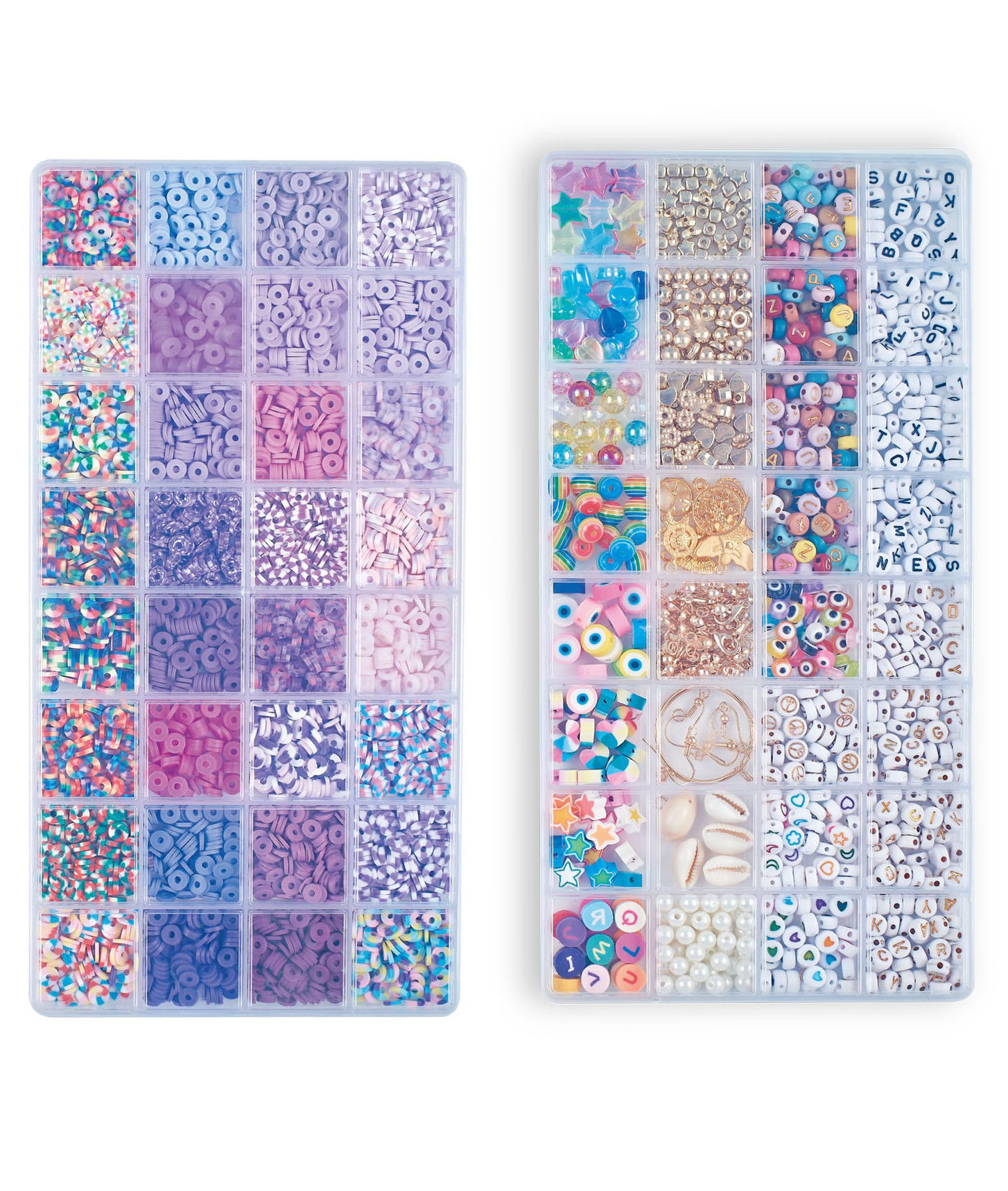 Un kit créatif pour fabriquer des bracelets destiné aux enfants de 6 ans et plus. Le kit contient deux boîtes transparentes compartimentées, chacune remplie de perles en argile polymère et d’autres éléments décoratifs. Contenu du kit : *Perles rondes et plates de différentes tailles et couleurs, principalement dans des tons violets, bleus, roses et blancs. *Perles fantaisie avec motifs (fleurs, étoiles, cœurs, smileys, lettres). *Perles alphabet pour former des mots ou des prénoms. *Perles en forme d’œil porte-bonheur et coquillages décoratifs. *Élastiques et fils pour assembler les bracelets. *Éléments métalliques dorés pour ajouter des détails décoratifs. L’emballage indique que le kit permet de réaliser plus de 34 pièces et met en avant un exemple de bracelets colorés avec des mots comme "SMILE", "LOVE" et "STAR".