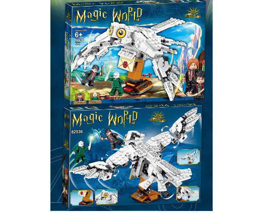 L’image montre un coffret de jeu de construction intitulé « Magic World », destiné aux enfants de 6 ans et plus. Le set comprend une grande chouette blanche articulée avec des ailes mobiles, perchée sur un support marron. La chouette tient une enveloppe dans ses serres, et le design rappelle un univers magique.