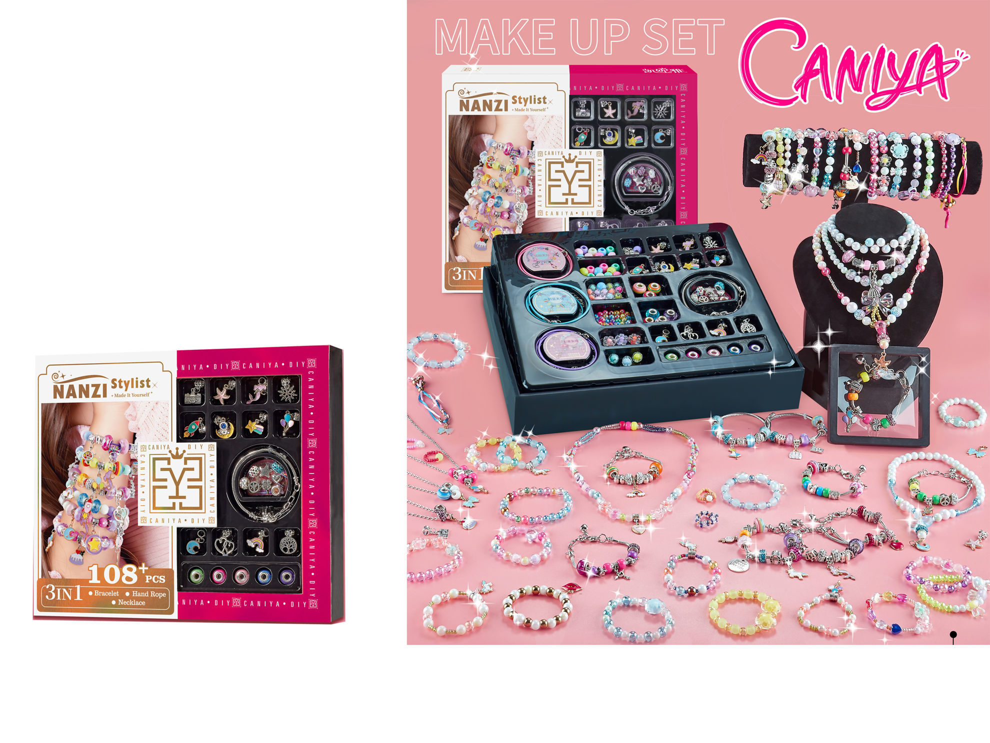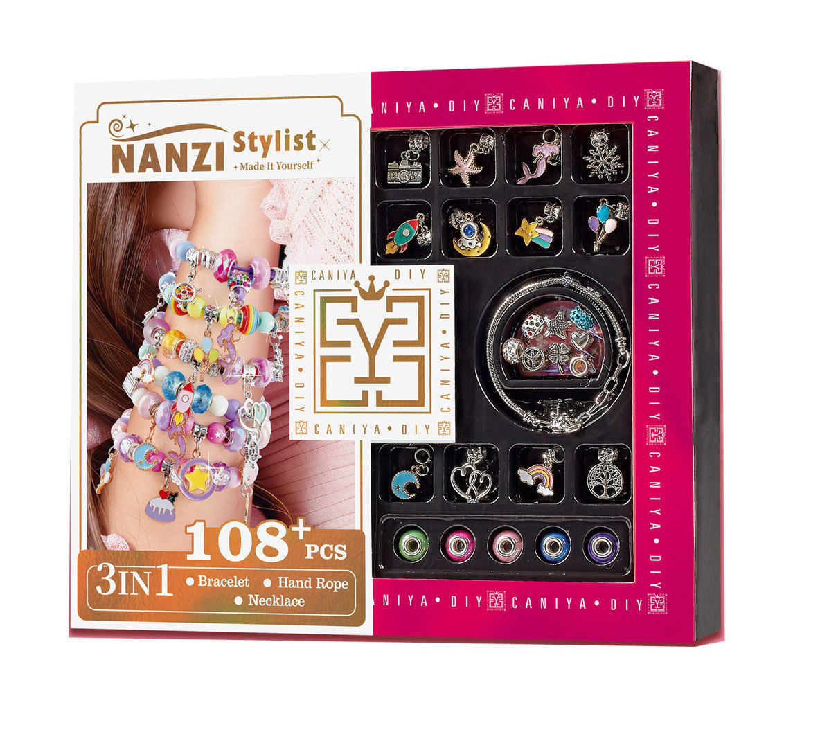 Ce coffret est un kit créatif permettant de fabriquer soi-même des bijoux personnalisés. Il contient plus de 108 pièces pour réaliser différents types d’accessoires : bracelets, cordons à main et colliers. Contenu du coffret : *Un assortiment de perles colorées et décoratives. *Des pendentifs variés (étoile de mer, arc-en-ciel, cœur, lune, etc.). *Plusieurs chaînes et cordons. *Des perles à gros trou de différentes couleurs. *Des éléments métalliques décoratifs. Utilisation : Ce kit est conçu pour permettre aux utilisateurs de créer des bijoux uniques en combinant les différents éléments selon leurs goûts. Il est adapté pour les activités manuelles, les cadeaux ou les loisirs créatifs.