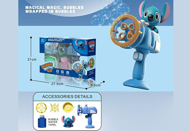 Type de produit : Jouet à bulles automatique pour enfants. Design : Pistolet à bulles avec un personnage de dessin animé bleu fixé sur le dessus. Fonctionnement : Le jouet utilise un disque rotatif avec plusieurs anneaux pour produire un grand nombre de bulles lorsqu’il est activé. Dimensions de l’emballage : 27,5 cm (longueur) × 8,5 cm (largeur) × 21 cm (hauteur).