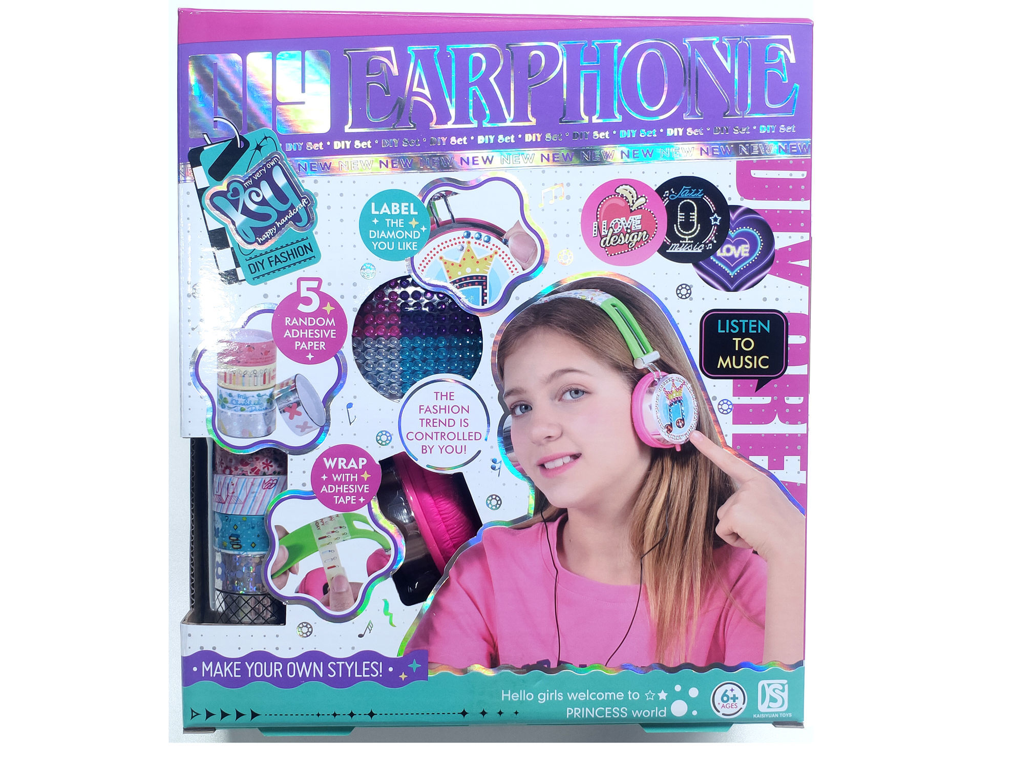 Ce coffret DIY Earphone est un kit créatif permettant de personnaliser un casque audio. Il contient : 5 rouleaux de papier adhésif décoratif aux motifs variés. Des étiquettes et strass pour embellir le casque. Un casque audio à décorer soi-même. Des instructions simples pour créer son propre style. Le principe est de coller et enrouler les bandes adhésives autour du casque, puis d’ajouter des autocollants et décorations pour un look unique. Le produit est adapté aux enfants à partir de 6 ans et permet d’écouter de la musique tout en exprimant sa créativité.