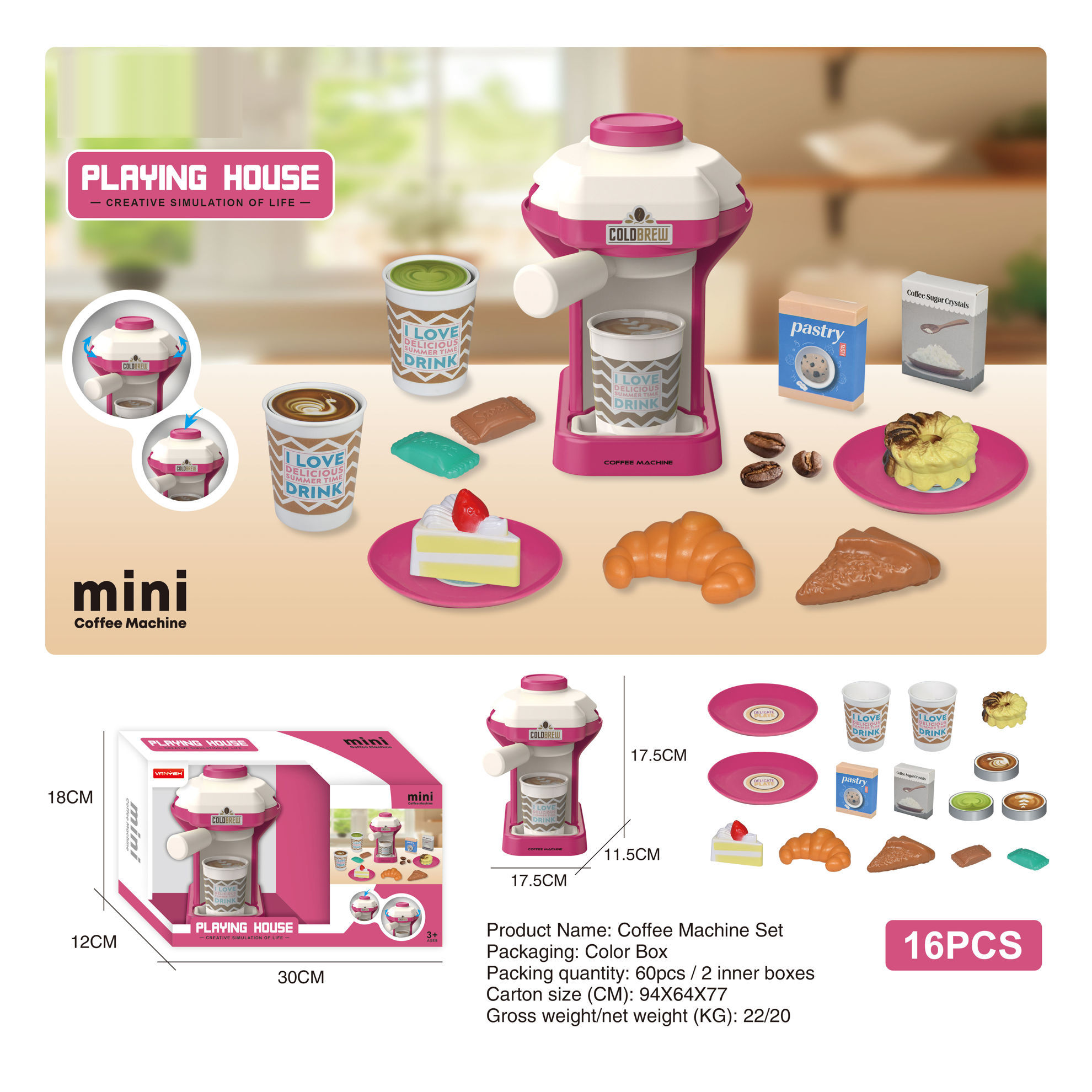 un ensemble de jeu de mini machine à café de 16 pièces conçu pour que les enfants puissent s'amuser à faire semblant. L'ensemble fait partie de la série « Jouer à la maison », qui encourage le jeu de rôle créatif et simule des activités de la vie réelle.