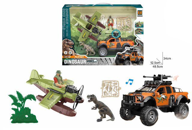 Ce coffret de jeu sur le thème des dinosaures comprend plusieurs éléments pour recréer des aventures de type exploration. Il inclut : Un avion biplan vert et marron avec un pilote figurine. Un véhicule tout-terrain orange et noir de type pick-up, décoré de motifs de dinosaures, équipé d’accessoires sur le toit et émettant des sons (icône de note de musique). Une figurine de dinosaure (type T-Rex). Un explorateur en tenue de safari. Des accessoires comme des plantes en plastique et un moule de fossiles. Dimensions approximatives de la boîte : 48,5 cm de long, 12,5 cm de large et 34 cm de haut. Ce jouet est conçu pour stimuler l’imagination des enfants en leur permettant de créer des scènes d’exploration et de capture de dinosaures.
