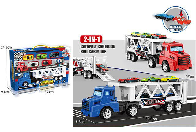 Ensemble de camion-remorque jouet 2-en-1 Cet ensemble de jouets représente un camion-remorque de transport de voitures avec deux modes de jeu : mode catapulte et mode rail. Le camion est disponible en deux couleurs principales (rouge et bleu) et est accompagné de plusieurs petites voitures colorées.