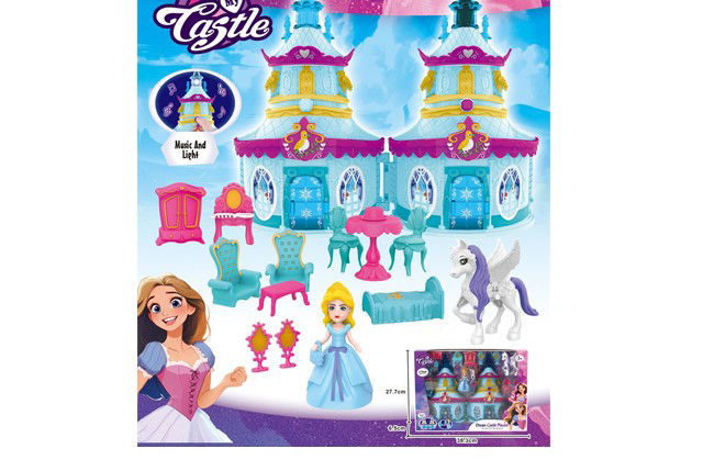Un ensemble de jeu château de princesse comprenant un grand château coloré (blanc, bleu, violet et jaune) avec deux tours, des meubles miniatures (fauteuils, table, armoire, coiffeuse, lit), une figurine de princesse en robe bleue et un cheval ailé blanc avec crinière violette. à partir de 3 ans et plus .