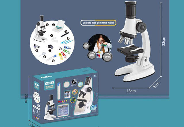 Ce visuel présente un kit de microscope éducatif destiné à l’exploration scientifique. Le microscope est de couleur blanche avec des détails noirs et mesure environ 23 cm de hauteur, 13 cm de longueur et 8 cm de largeur. Il est équipé de plusieurs objectifs permettant des grossissements allant jusqu’à 600x et 1200x.