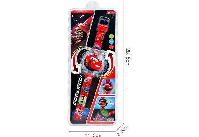 Cette image montre une montre digitale pour enfants inspirée du film d’animation Cars. Le bracelet et le cadran sont décorés avec des illustrations colorées de Flash McQueen et d’autres personnages du film. L’emballage est en plastique transparent, permettant de voir la montre, et présente des visuels promotionnels du film.