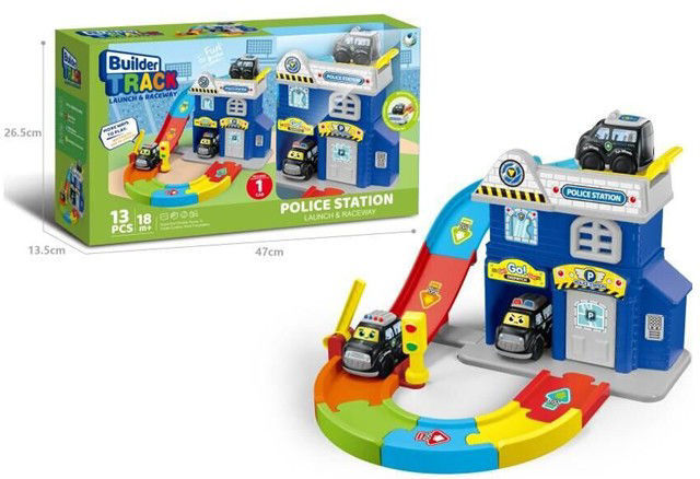 Ce jouet est un ensemble de jeu pour enfants représentant un poste de police avec une piste de lancement et de course. Il est composé de 13 pièces et est recommandé pour les enfants de 18 mois et plus.