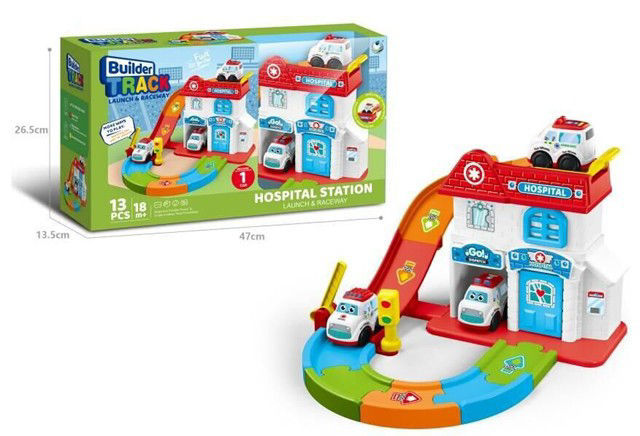 Ce jouet est un ensemble de jeu en plastique coloré représentant une station d’hôpital avec une piste de lancement et de course pour petites voitures. Il comprend 13 pièces au total, dont un bâtiment à deux niveaux avec une rampe rouge, des portes bleues, et des décorations imitant un hôpital (panneaux, croix médicale, fenêtres).