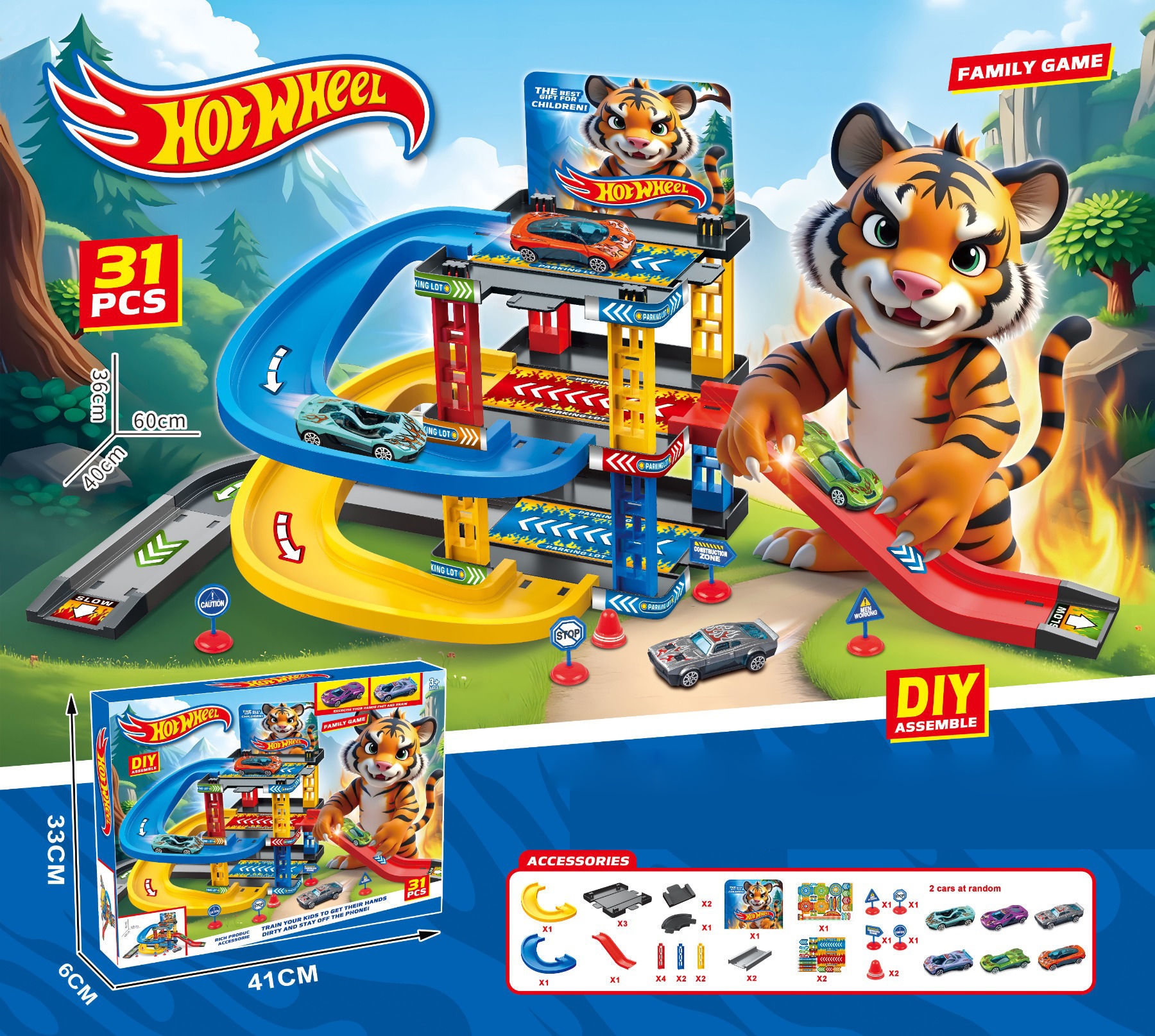 Cette image présente un coffret de jeu Hot Wheels composé de 31 pièces. Le jouet est une piste de course multi-niveaux colorée, avec des rampes bleues, jaunes et rouges, ainsi que des piliers de soutien décorés de flèches directionnelles. Un grand tigre illustré tient une voiture verte sur une rampe rouge, ajoutant un aspect ludique et attractif.