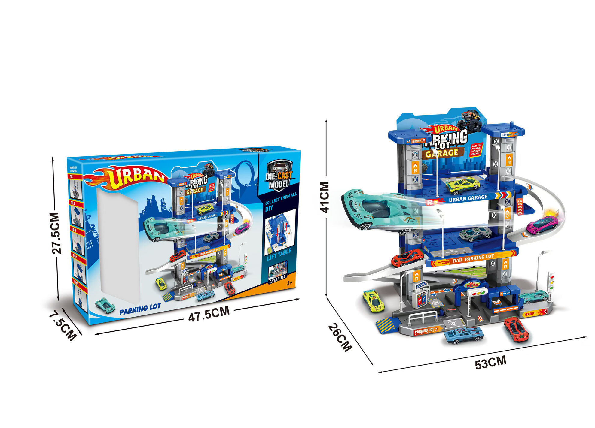 L’image présente un jouet de type garage de stationnement à plusieurs étages destiné aux enfants. Il est composé de trois niveaux reliés par des rampes en spirale permettant aux voitures miniatures de monter et descendre. Le garage est décoré avec des panneaux, des ascenseurs simulés et des zones de stationnement. Dimensions : Boîte d’emballage : environ 47,5 cm de long, 27,5 cm de haut et 7,5 cm de profondeur. Garage assemblé : environ 53 cm de long, 41 cm de haut et 26 cm de profondeur.