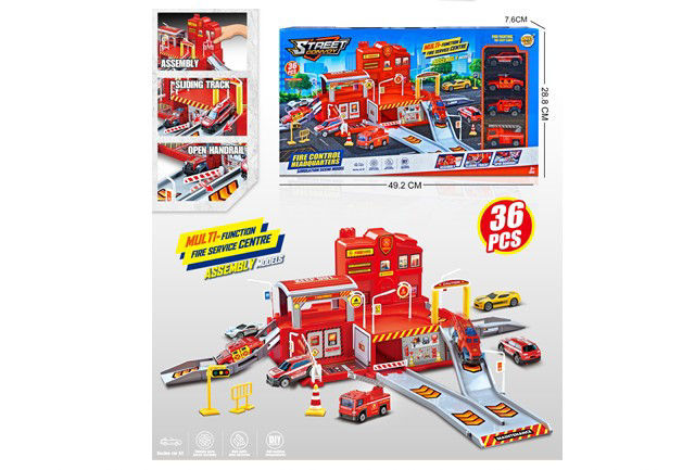 jouet centre de secours multifonction avec circuits et véhicules de pompier , composé de 36 pièces idéal pour stimuler l'imagination et le jeu de rôle. dimensions: 48.5*29*7.5 cm