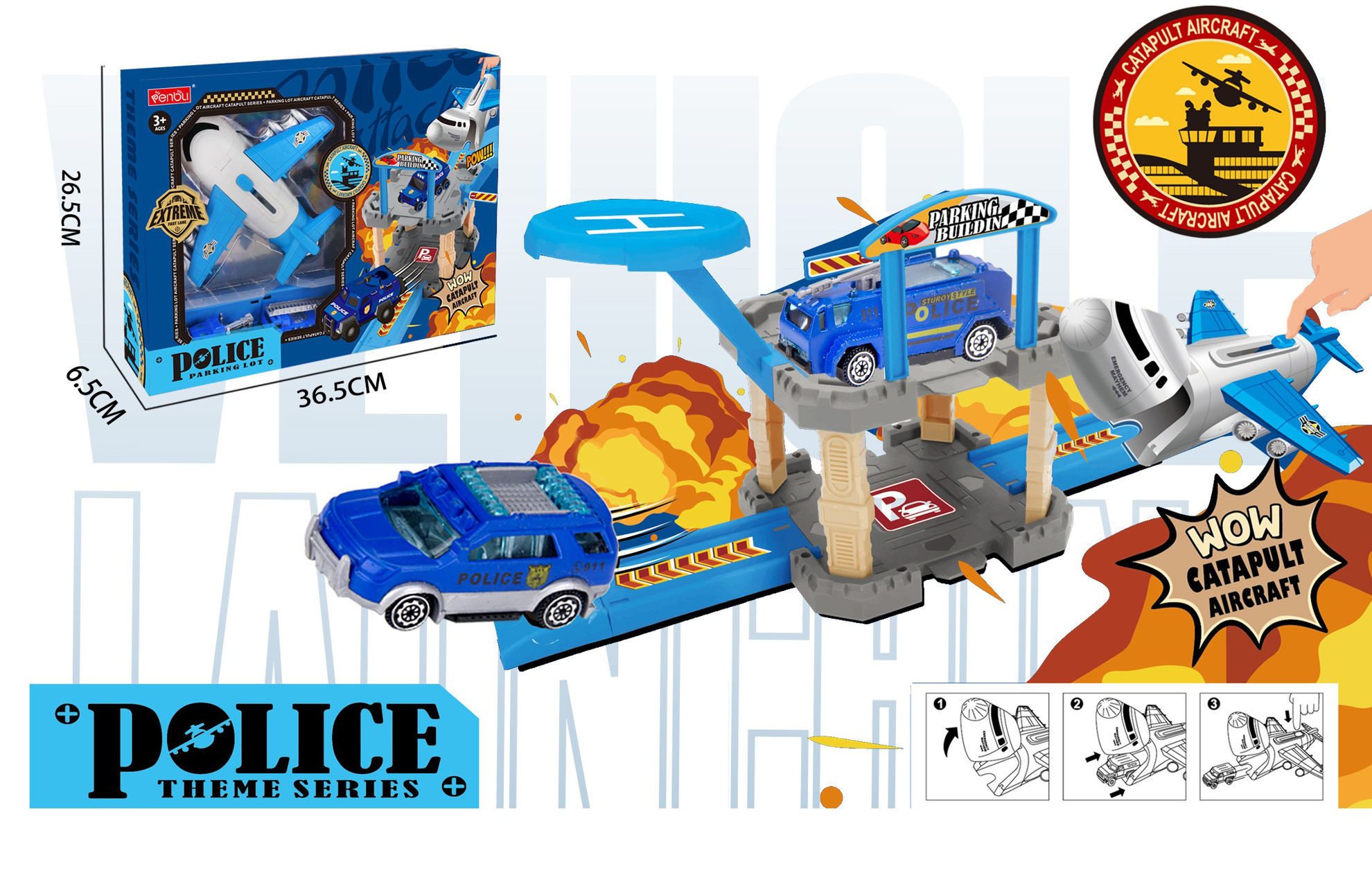 Ce jouet est un coffret de jeu sur le thème de la police comprenant plusieurs éléments interactifs. Le set inclut : *Un avion de police blanc et bleu avec une fonction de catapulte permettant de lancer l’avion. *Deux véhicules de police miniatures, dont un SUV et un fourgon, de couleur bleue avec marquages "POLICE". *Une structure de parking à deux niveaux avec rampe d’accès, zone d’atterrissage pour hélicoptère ou avion. Ce jouet est destiné aux enfants à partir de 3 ans.