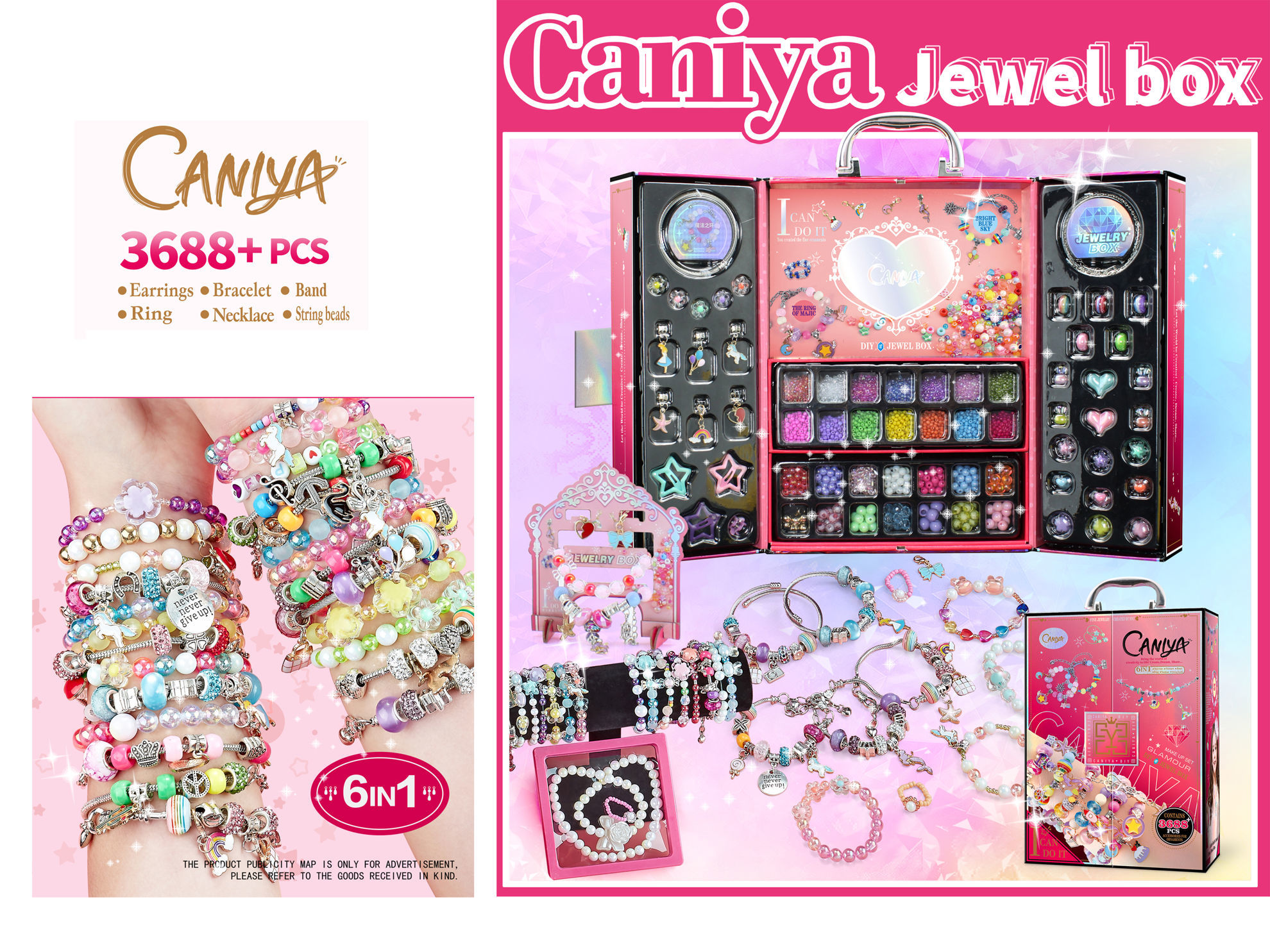 Un coffret créatif complet contenant plus de 3688 pièces pour fabriquer vos propres bijoux. Il inclut des éléments pour réaliser des boucles d’oreilles, bracelets, bagues, colliers, bandes et perles à enfiler. Contenu du coffret : *Une grande variété de perles colorées et décoratives. *Des pendentifs en forme de cœur, étoile et autres motifs fantaisie. *Des chaînes, fils et accessoires pour assembler les bijoux. *Un boîtier de rangement élégant avec poignée pour transporter facilement le kit. Ce coffret est parfait pour exprimer sa créativité, fabriquer des cadeaux personnalisés ou simplement s’amuser à créer des accessoires uniques.