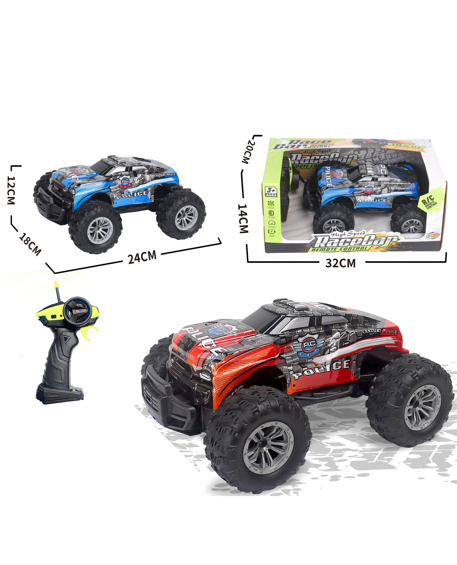 Cette image présente une voiture télécommandée tout-terrain de type "monster truck" avec un design inspiré des véhicules de police. Le jouet est disponible en deux coloris : bleu et rouge, chacun arborant des motifs de carrosserie détaillés et des inscriptions "POLICE". Caractéristiques principales : Dimensions de la voiture : environ 24 cm de long, 18 cm de large et 12 cm de haut. Dimensions de l’emballage : environ 32 cm de long, 20 cm de large et 14 cm de haut. Télécommande : modèle à poignée avec antenne, utilisant la technologie 2,4 GHz pour un meilleur contrôle à distance. Roues : grandes roues crantées pour une meilleure adhérence sur différents types de terrain. Âge recommandé : à partir de 3 ans. Ce jouet est conçu pour offrir une conduite rapide et stable, adapté aux enfants et aux amateurs de voitures RC.