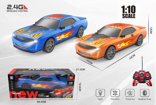 voiture avec des motifs de flammes sur les côtés et le capot. Elles sont équipées d'une commande sans fil 2,4 GHz et de pneus en caoutchouc pour une meilleure adhérence. Dimensions de la voiture : Longueur : 42 cm Largeur : 17 cm Hauteur : 12 cm