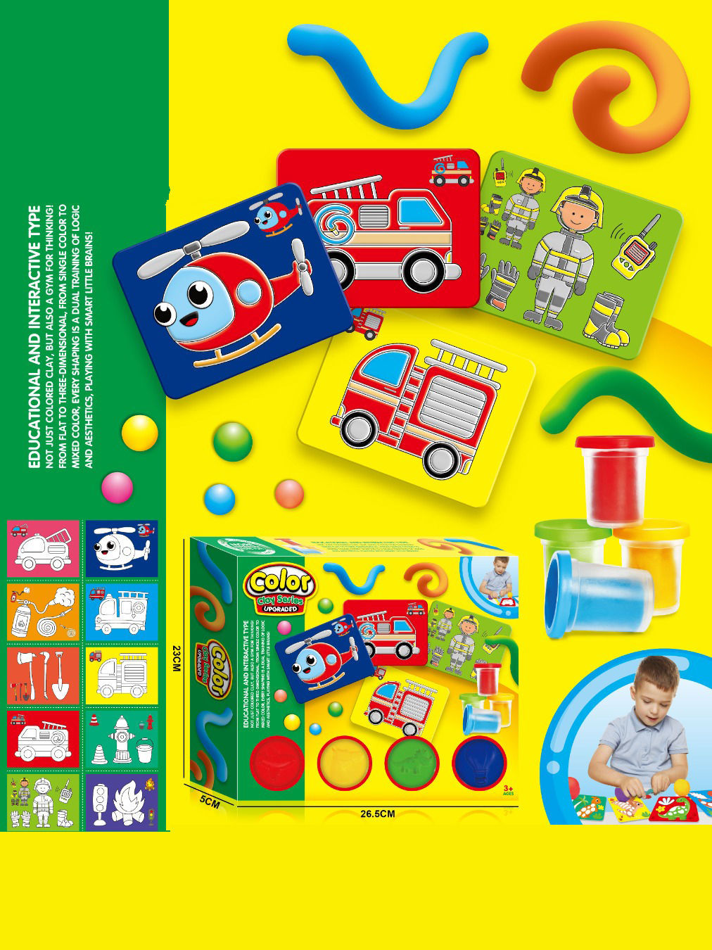 Cet ensemble éducatif de pâte à modeler est conçu pour stimuler la créativité, la logique et la motricité fine des enfants. Il comprend plusieurs cartes illustrées sur le thème des véhicules de secours (hélicoptère, camion de pompiers, pompier et accessoires), ainsi que des pots de pâte à modeler de différentes couleurs.