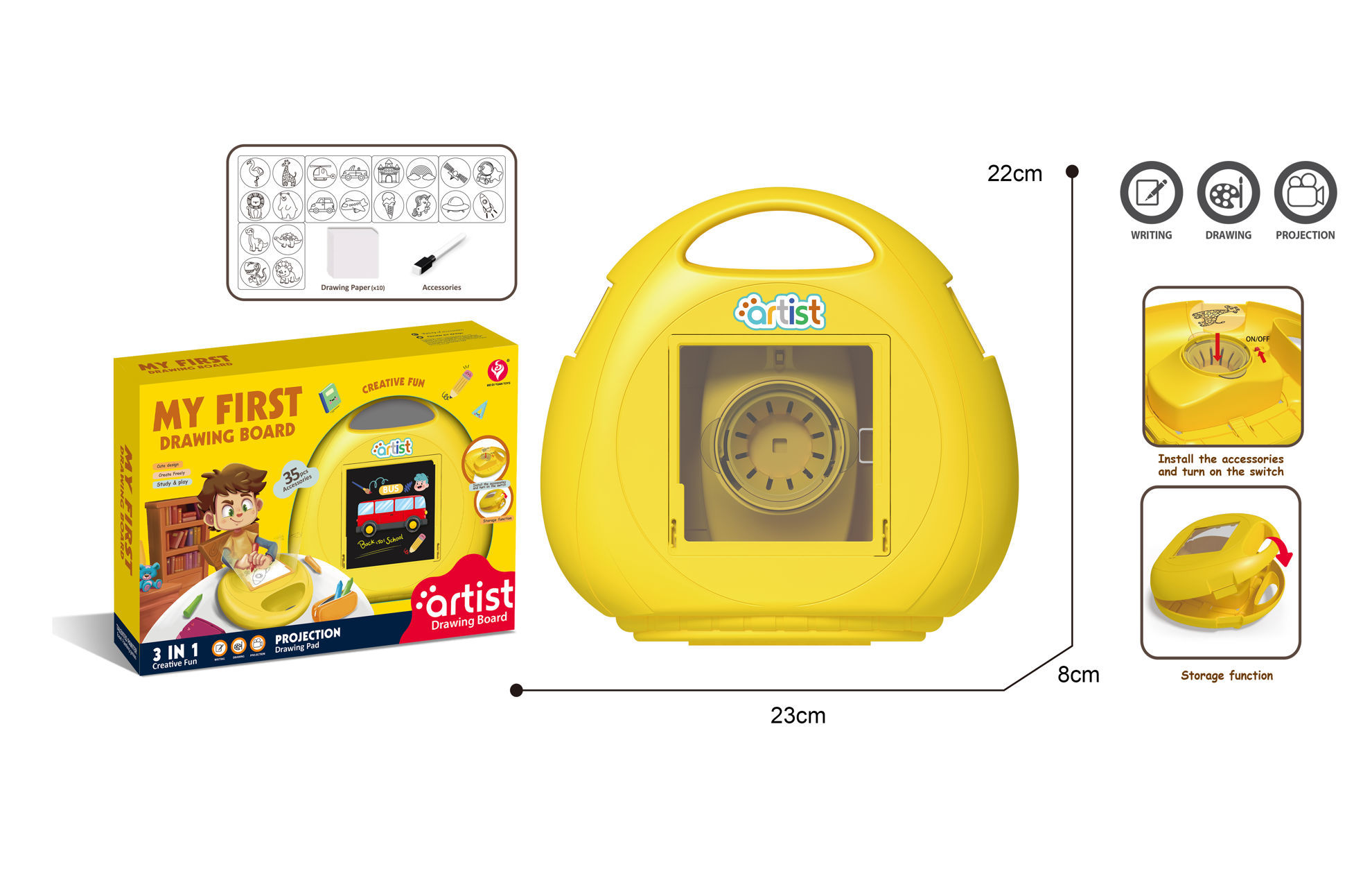 Le "My First Drawing Board" est un jouet éducatif créatif destiné aux enfants, combinant écriture, dessin et projection. Il est conçu pour aider les plus jeunes à développer leurs compétences artistiques tout en s'amusant.