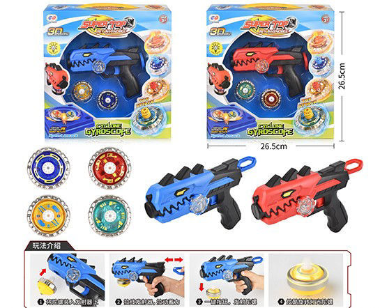 Ce jouet est un ensemble de lanceur et toupies destiné aux enfants. Dimensions de la boîte : environ 26,5 cm de hauteur et 26,5 cm de largeur. Ce jouet est conçu pour des jeux de compétition de toupies, favorisant la coordination et la rapidité.