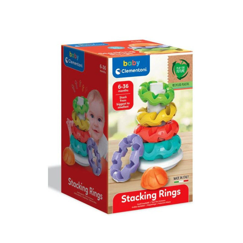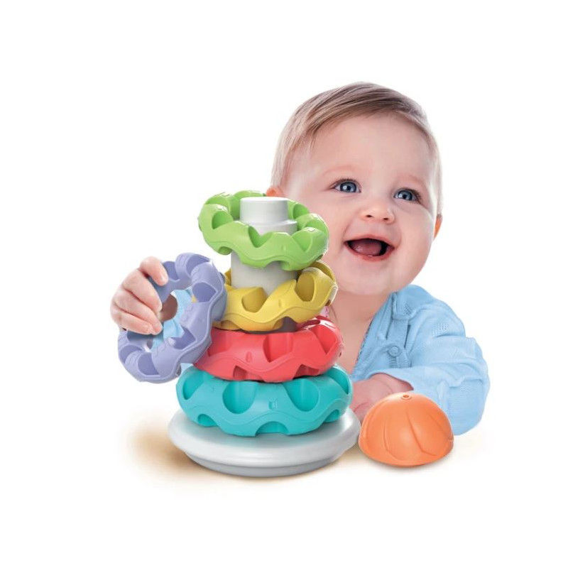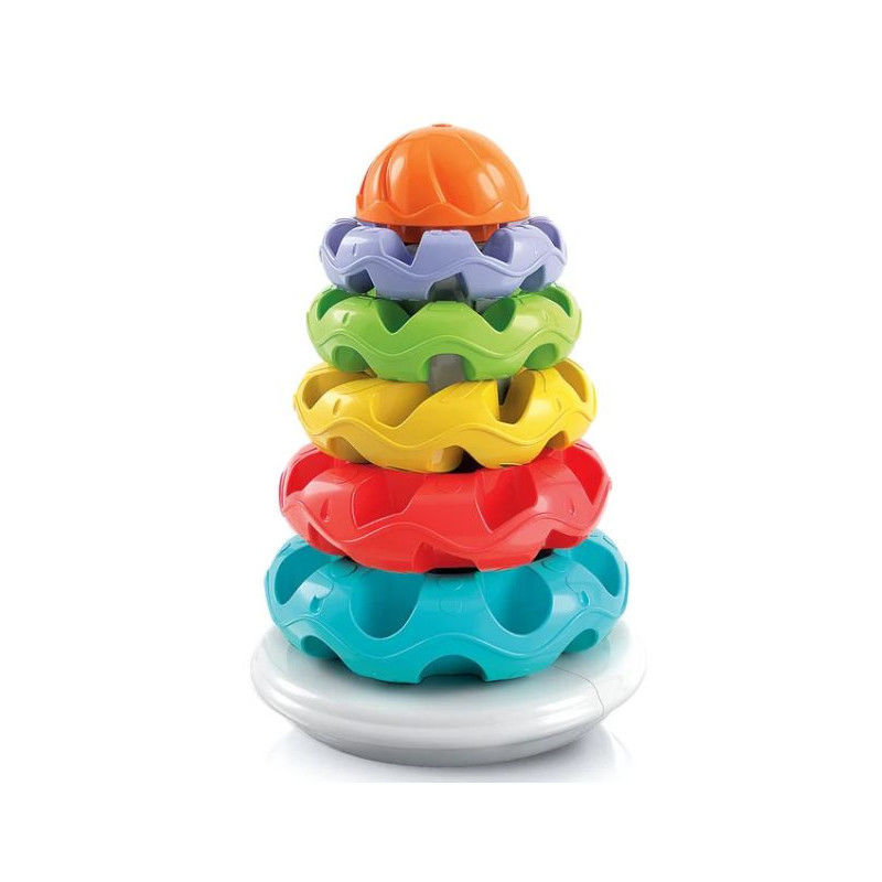 5 anneaux colorés de différentes formes et tailles, à empiler sur une tour. Les anneaux sont conçus avec des reliefs différents qui stimulent la perception tactile des enfants durant leurs premiers mois. Stimule la motricité fine et la perception visuelle. Aide l'enfant à reconnaître les couleurs, les formes et à percevoir les tailles. Dimensions : 24 x 15 x 15 cm