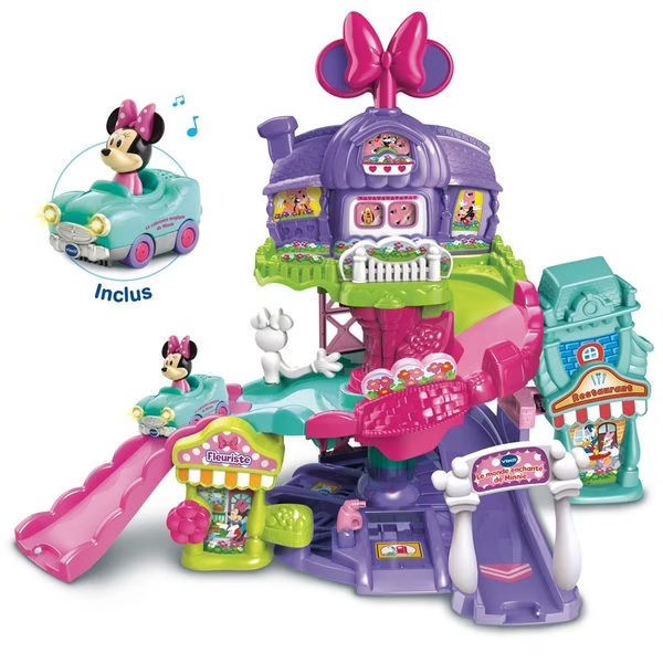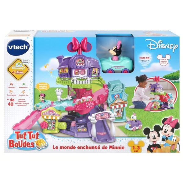 Tut Tut Bolides, Le monde enchanté de Minnie est un univers interactif pour passer des journées magiques en compagnie de Minnie. Minnie parle et chante dans son cabriolet magique avec la vraie voix Disney. La voiture électronique fait interagir le personnage, il suffit d’appuyer dessus ou de faire passer la voiture sur une zone magique. Votre enfant suscite son imagination et peut inventer de nouvelles histoires pour ses véhicules dans cet univers 100% Disney. Grâce au lanceur, Minnie dévale la piste à toute vitesse . Ce jeu d'éveil aide votre enfant à construire sa motricité en manipulant de nombreux éléments dès son premier âge : fleur, aiguillage, pompe à essence… Lorsqu'il appuie sur le nœud papillon au sommet de la maison, Figaro le chat apparaît comme par magie. Ce jouet électronique dispose de 4 zones magiques qui déclenchent des phrases et sons rigolos. 3 chansons, 4 mélodies, des phrases et sons rigolos rythment le jeu. Un véhicule interactif de Minnie est inclus pour pouvoir jouer tout de suite.
